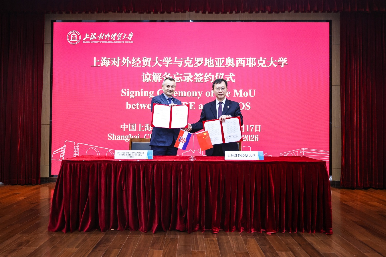 随后,汪荣明校长与Jurislav Babic副校长共同签署了上海对外经贸大学与奥西耶克大学谅解备忘录。