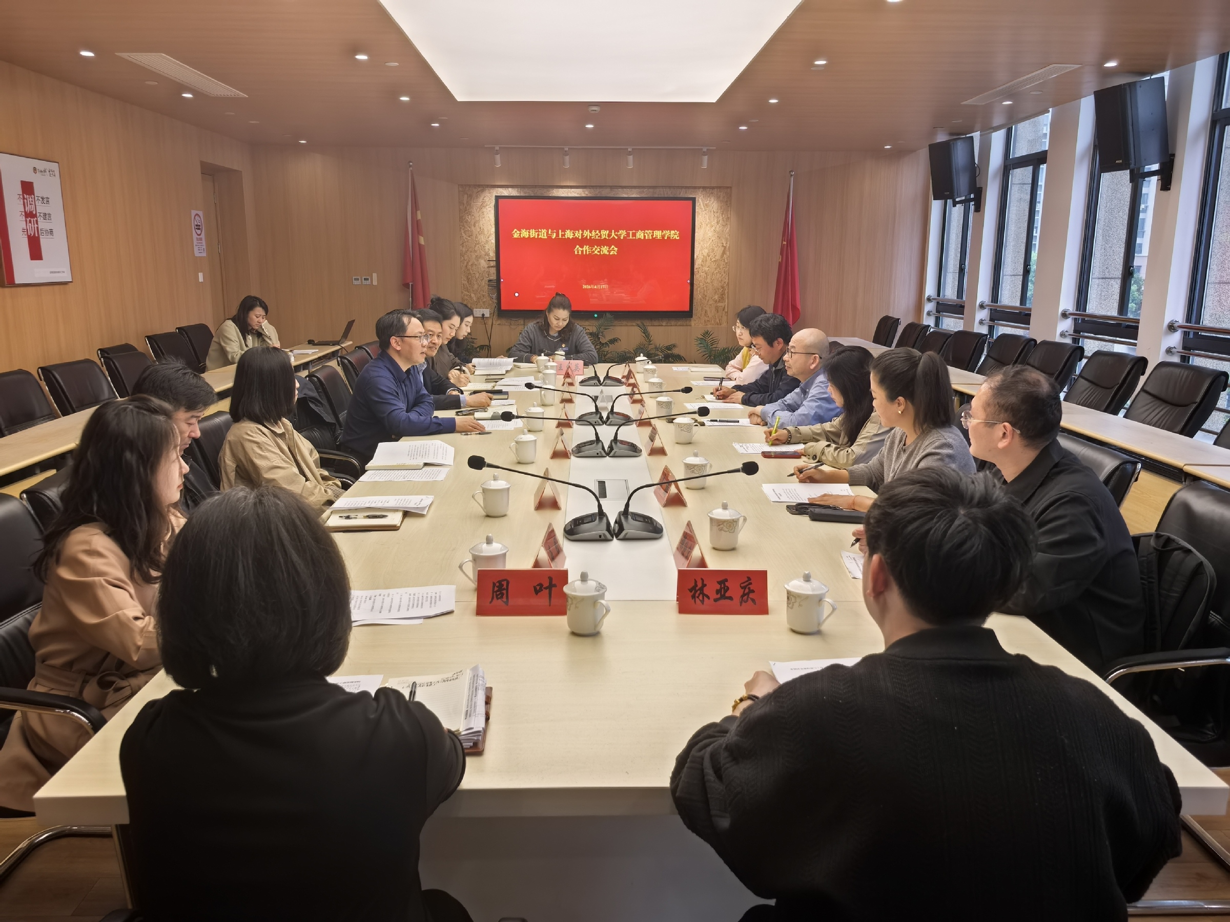4月17日,工商管理学院院长龙江,党委副书记张瑞娟,系主任左鹏、戴永辉、梁玲,教师代表郝欣宇和倪玮婷一行赴奉贤区金海街道走访交流,聚焦面向人才培养模式改革的校地资源联动路径创新探索与实践进行调研。金海街道党工委书记、人大工委主任朱崇江,街道党工委委员、办事处副主任金杰,党群办主任顾冰雁,社区管理办主任张卉,营商办主任高燕杰,团工委书记金思慧,妇联主席原田,社区事务受理服务中心主任王群英、副主任周叶以及星海创立方主理人林亚庆参加合作交流会。