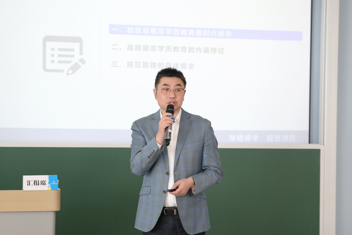 本次培训特邀中国成人教育协会学分银行专委会副理事长、上海市成人教育协会院校教育专业委员会主任、上海商学院国际教育学院党委书记陈巍作题为《规范管理赋能非学历教育创新发展》专题讲座。他围绕加快发展非学历教育的时代使命、高质量非学历教育的内涵特征和规范非学历教育的具体要求等3个方面,结合具体案例和工作实际进行了深入讲解,为学校推动非学历教育高质量发展提供了宝贵的理论指导和实践经验。