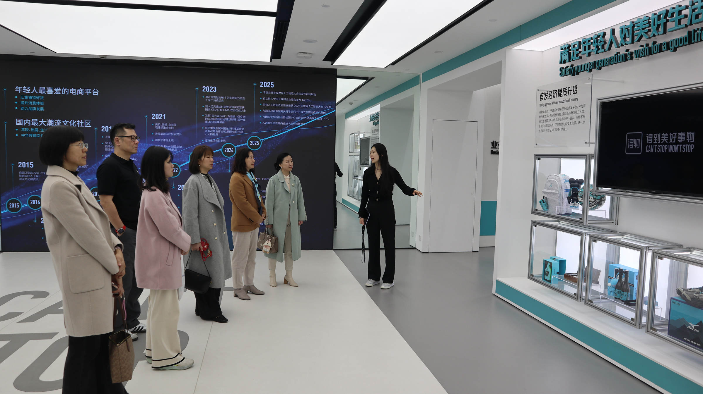 仪式后,学院一行实地参观了得物集团展厅。在展厅工作人员的细致讲解下,深入了解了得物的发展历程、核心产品矩阵及人工智能业务创新成果。通过近距离感受企业的创新氛围与运营模式,学院一行对得物的战略布局及未来人才需求方向有了更为直观和深刻的理解。