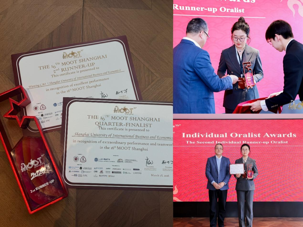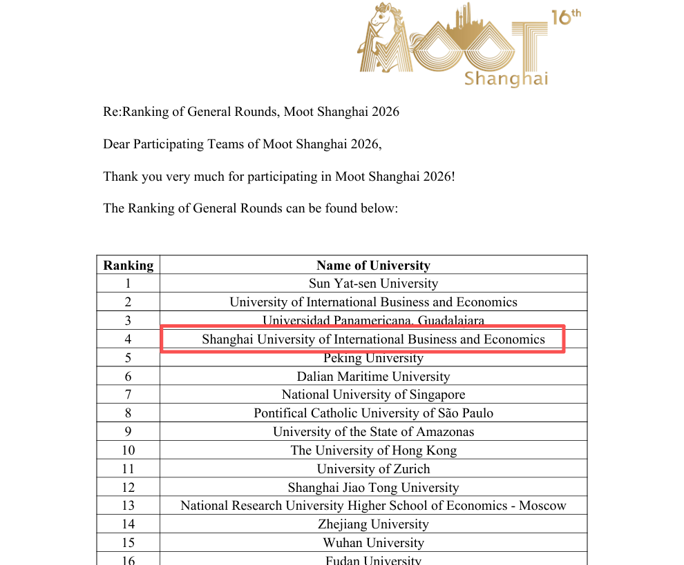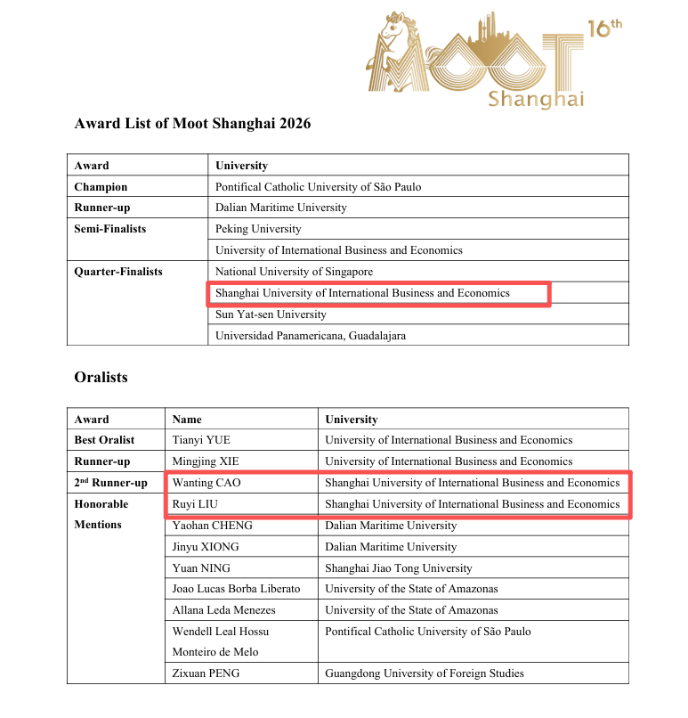 近日,Moot Shanghai 2026国际商事模拟仲裁庭全球赛落下帷幕。我校法学院代表队在来自世界各地高校的参赛队伍中表现出色,经过多轮激烈角逐,最终以全球第四,中国第二的积分晋级淘汰赛环节,最终获得全球前八强的好成绩。2023级经法专业本科生曹菀庭荣获全球季军最佳辩手(Second Runner-up Oralist),2023级经法专业本科生刘如意荣获个人突出奖(Individual Excellence Awards),创造了我校自参加该赛事以来的历史最好成绩。